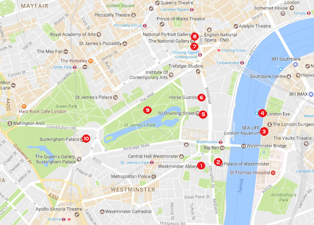 Po powrocie przez Most Westminsterski na Pariament Square kierujemy się w prawo ulicą Whitehall w stronę Trafalgar Square. Po drodze przechodzimy obok najsłynniejszego adresu w Londynie – 10 Downing Street, oraz placu defilad – Horse Guards Parade.